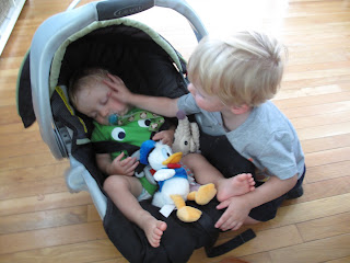 One of their favorite moments in the day is between lunchtime and naps. We always head upstairs, get diapers on for nap, and spend about fifteen minutes playing in Aiden's bedroom before storytime. I seriously think that it may be Andrew's favorite time of day:) Here are the two playing in Aiden's bed (and can you tell that Andrew found on Aiden's pacis?!?!)